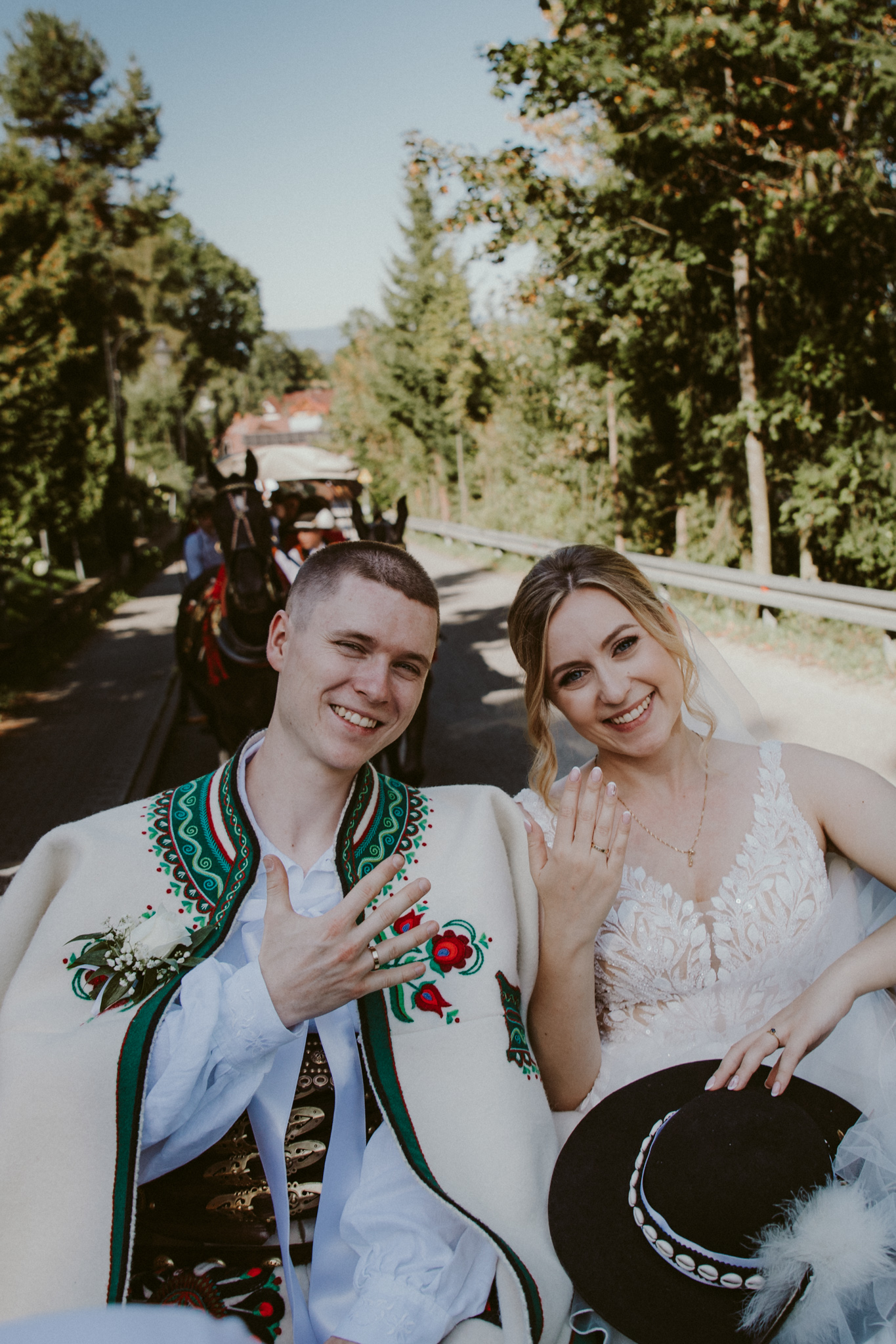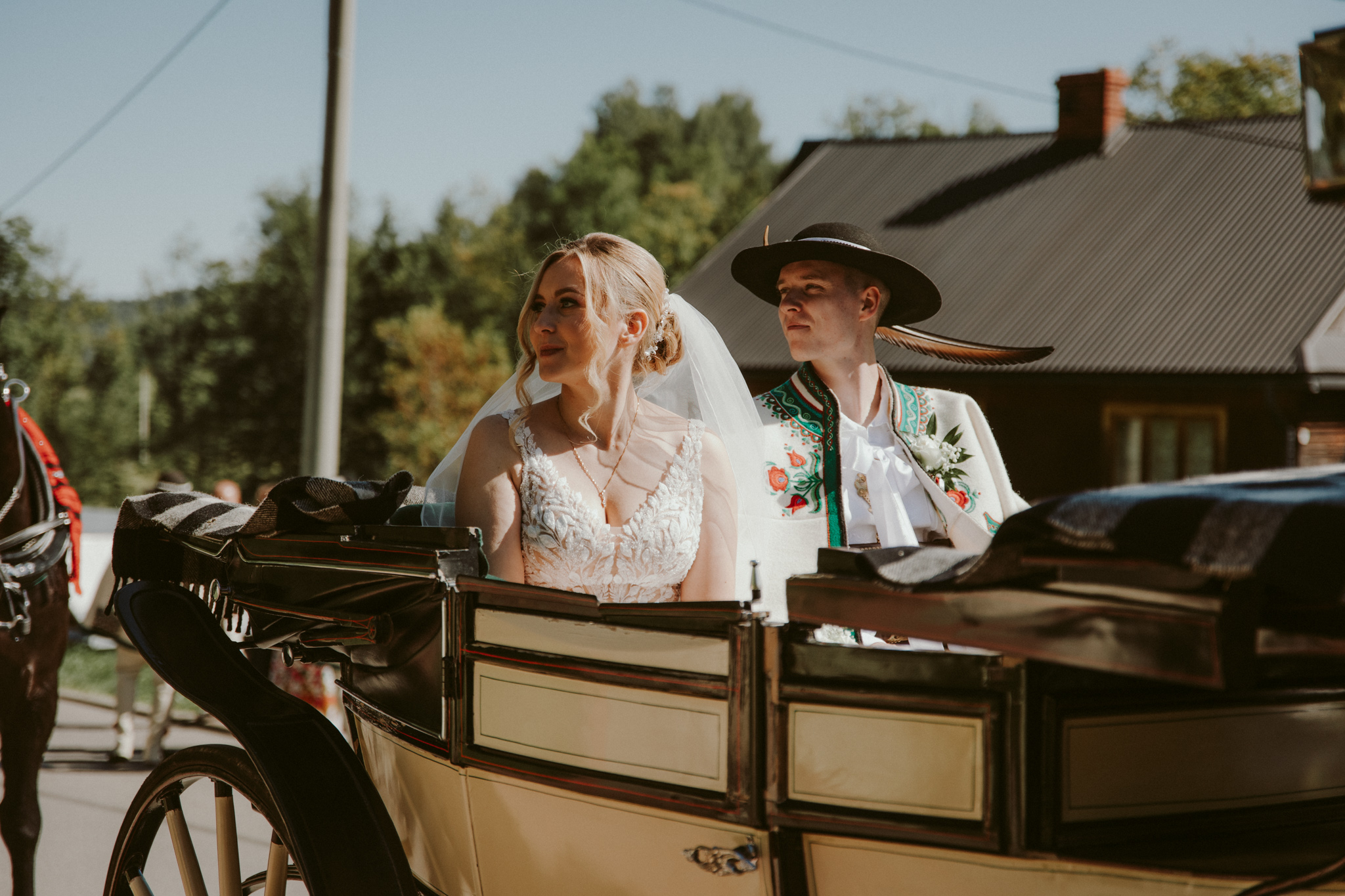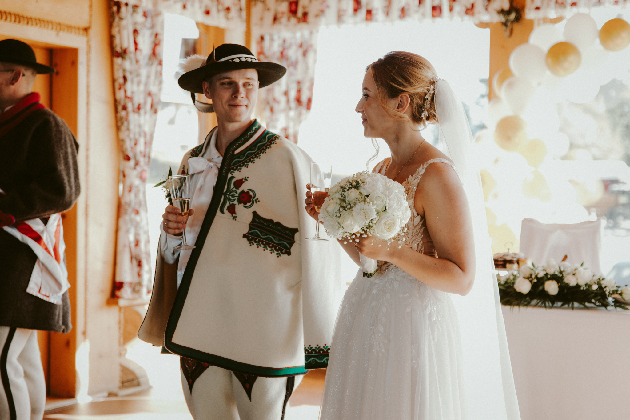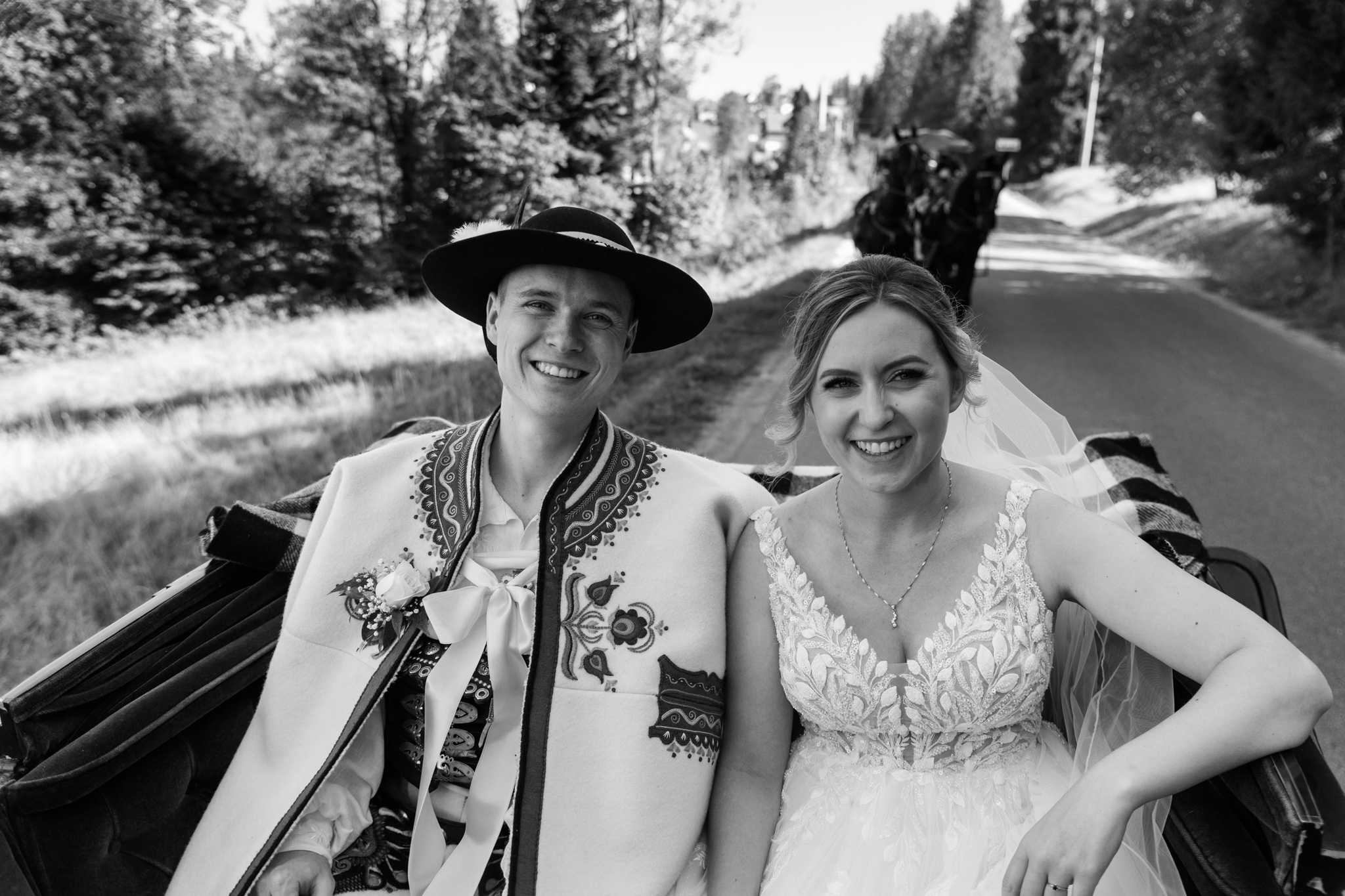 Zosia i Michał poznali się na studiach geodezyjnych – tam, między mapami i pomiarami, zaczęli kreślić wspólny plan na życie. We wrześniu przysięgli sobie miłość w kościele w Brzegach, niedaleko Bukowiny Tatrzańskiej. Górskie powietrze pachniało jesienią, a dźwięk skrzypiec mieszał się ze śmiechem i okrzykami gości w barwnych, góralskich strojach. Para młoda przyjechała bryczką zaprzężoną w konie, prowadzoną przez górali. Michał w tradycyjnym stroju góralskim i Zosia w delikatnej, klasycznej sukni wyglądali jak z opowieści – nowoczesność spotkała się z tradycją, tworząc historię, którą długo będziemy pamiętać.