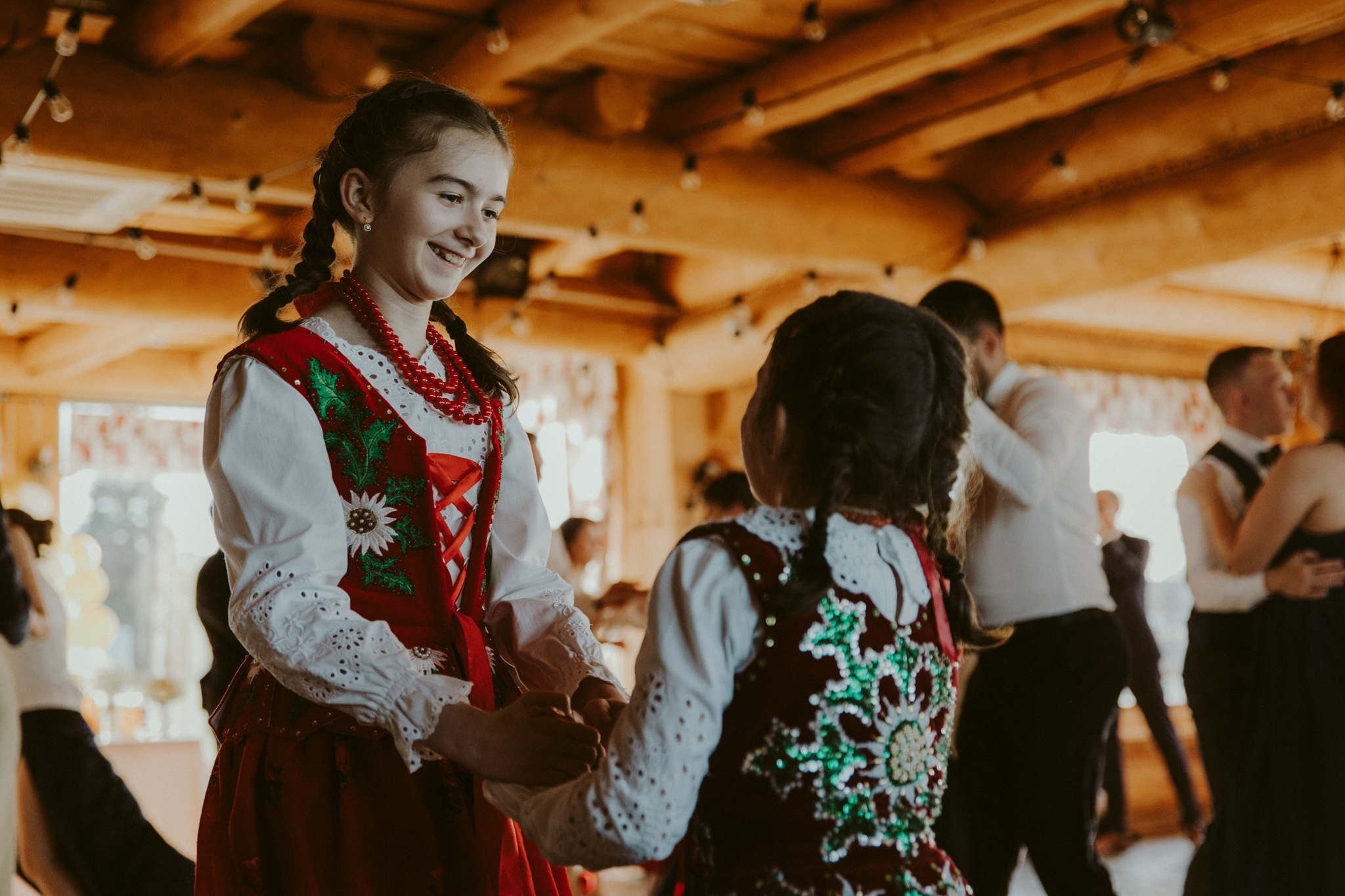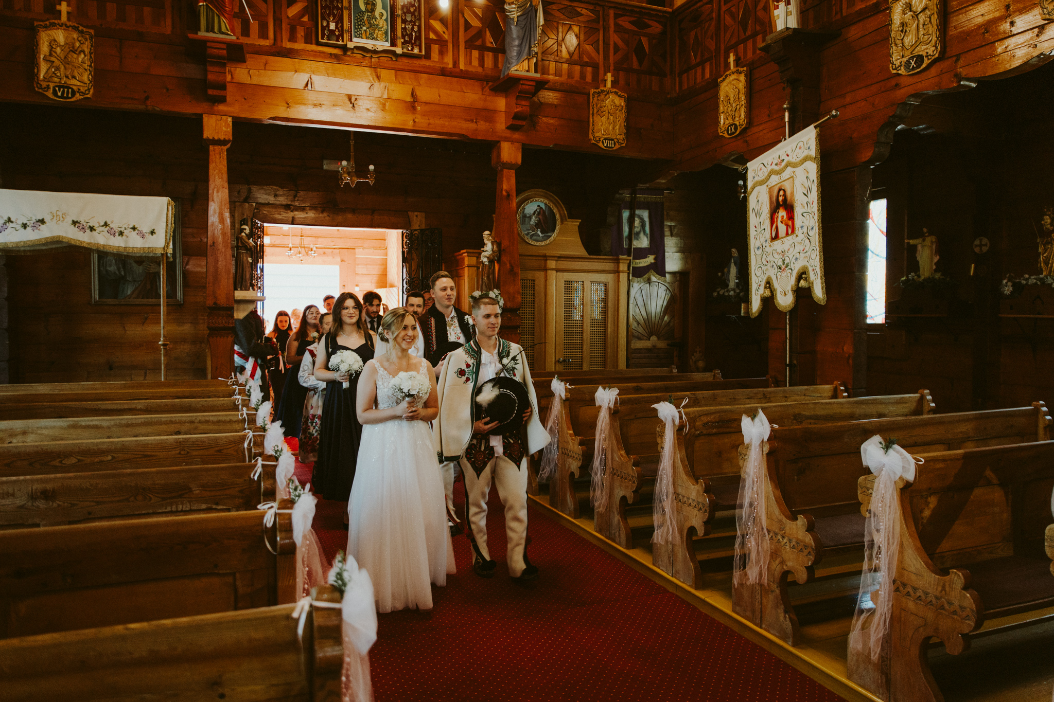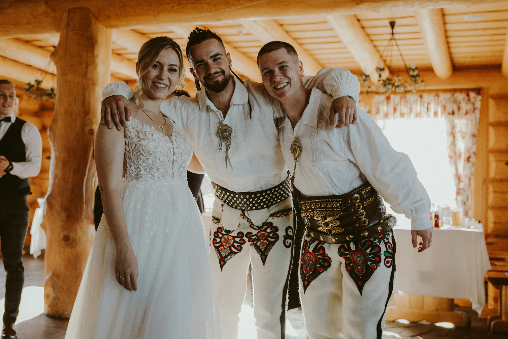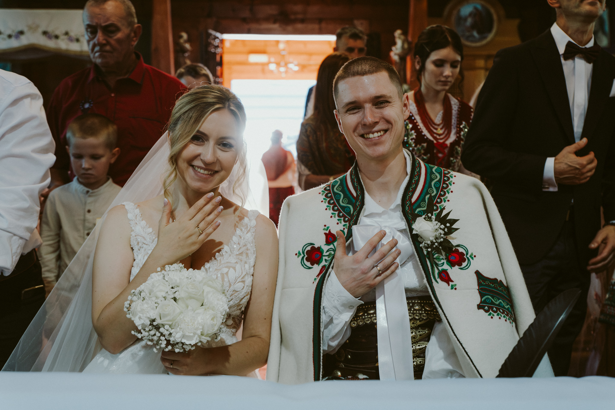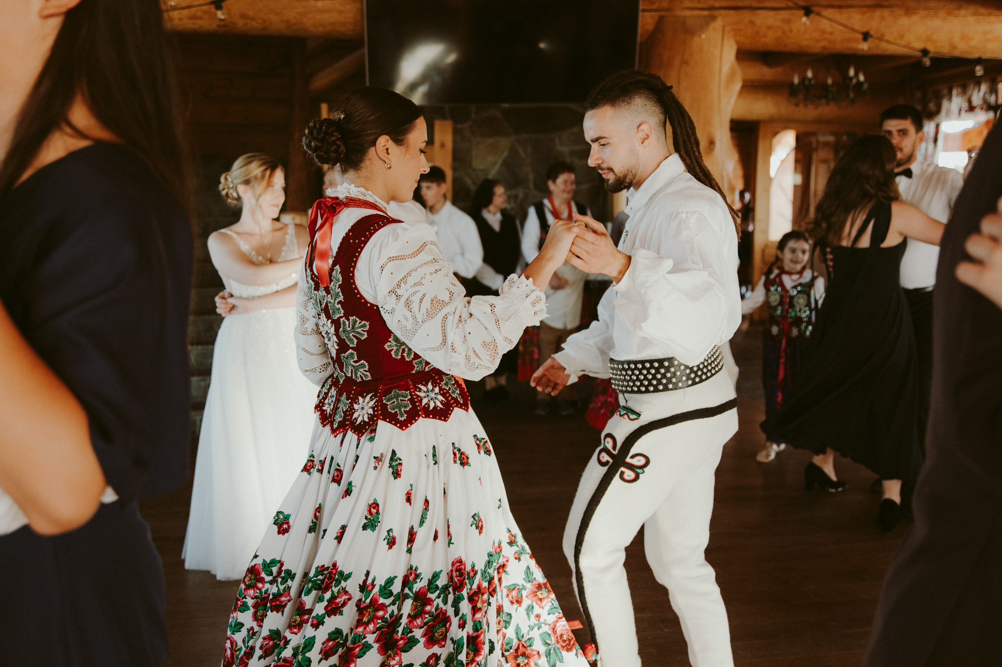 Zosia i Michał poznali się na studiach geodezyjnych – tam, między mapami i pomiarami, zaczęli kreślić wspólny plan na życie. We wrześniu przysięgli sobie miłość w kościele w Brzegach, niedaleko Bukowiny Tatrzańskiej. Górskie powietrze pachniało jesienią, a dźwięk skrzypiec mieszał się ze śmiechem i okrzykami gości w barwnych, góralskich strojach. Para młoda przyjechała bryczką zaprzężoną w konie, prowadzoną przez górali. Michał w tradycyjnym stroju góralskim i Zosia w delikatnej, klasycznej sukni wyglądali jak z opowieści – nowoczesność spotkała się z tradycją, tworząc historię, którą długo będziemy pamiętać.
