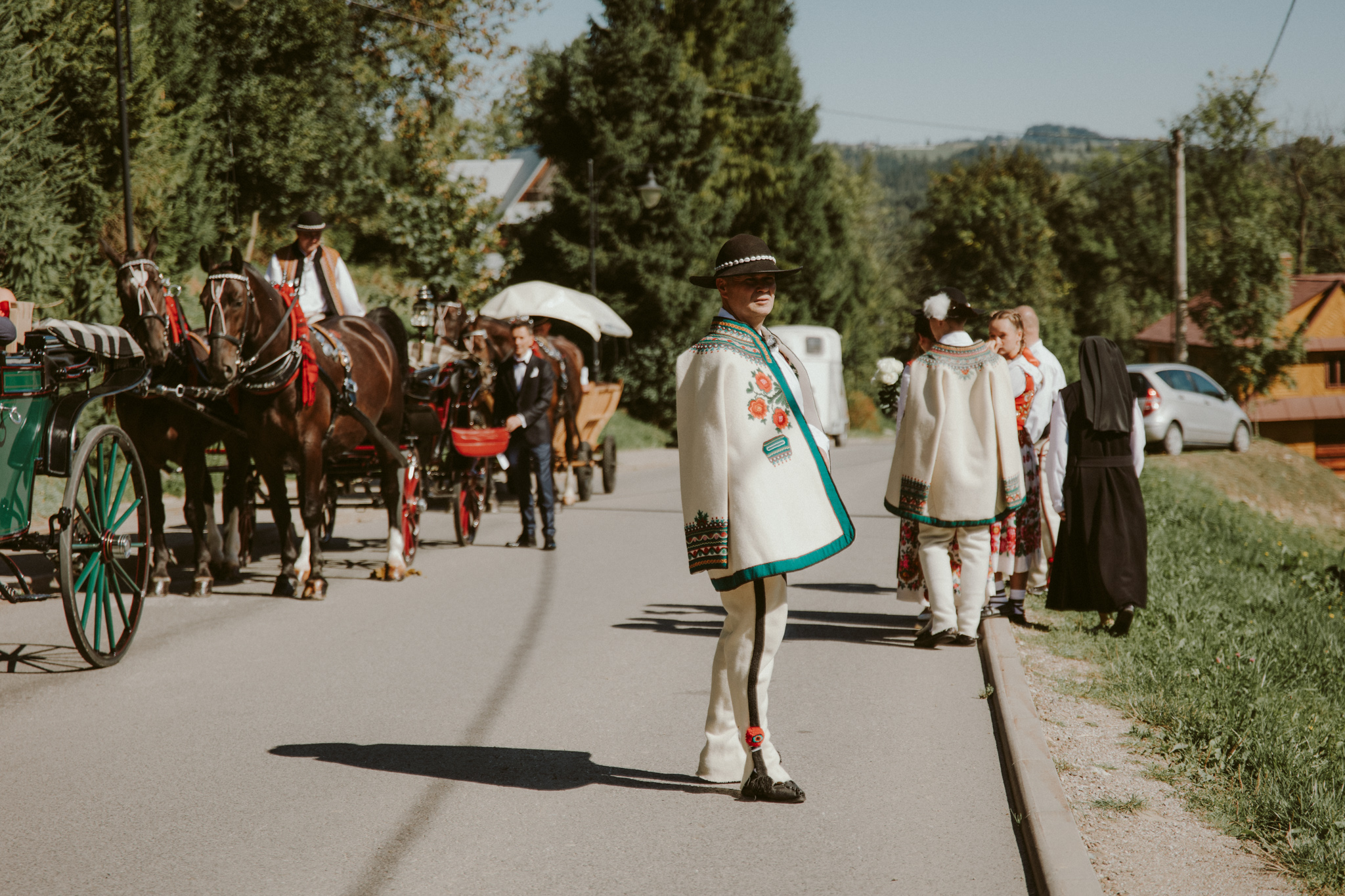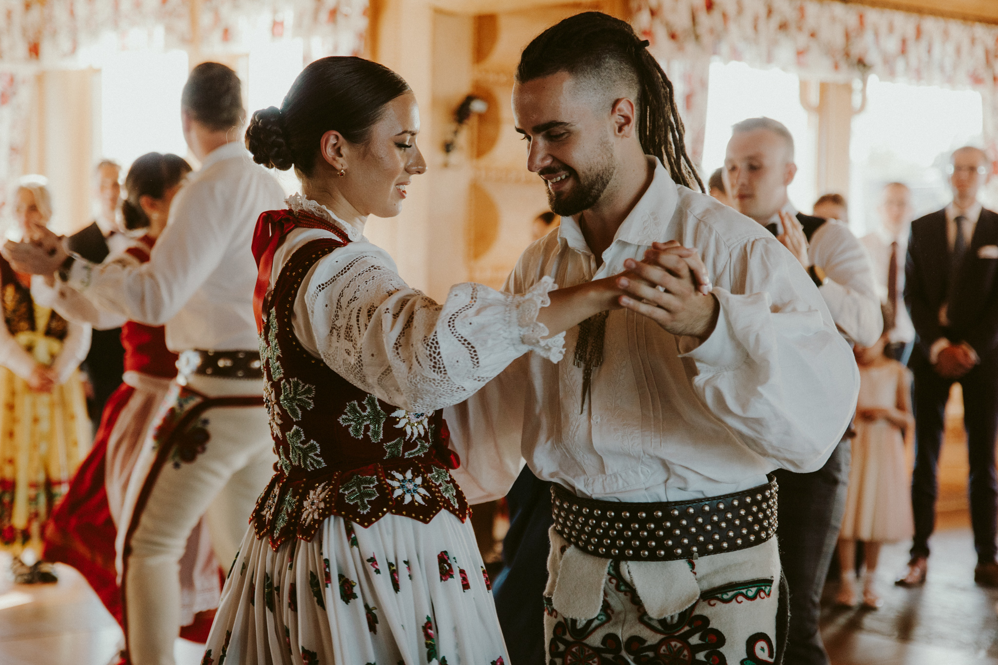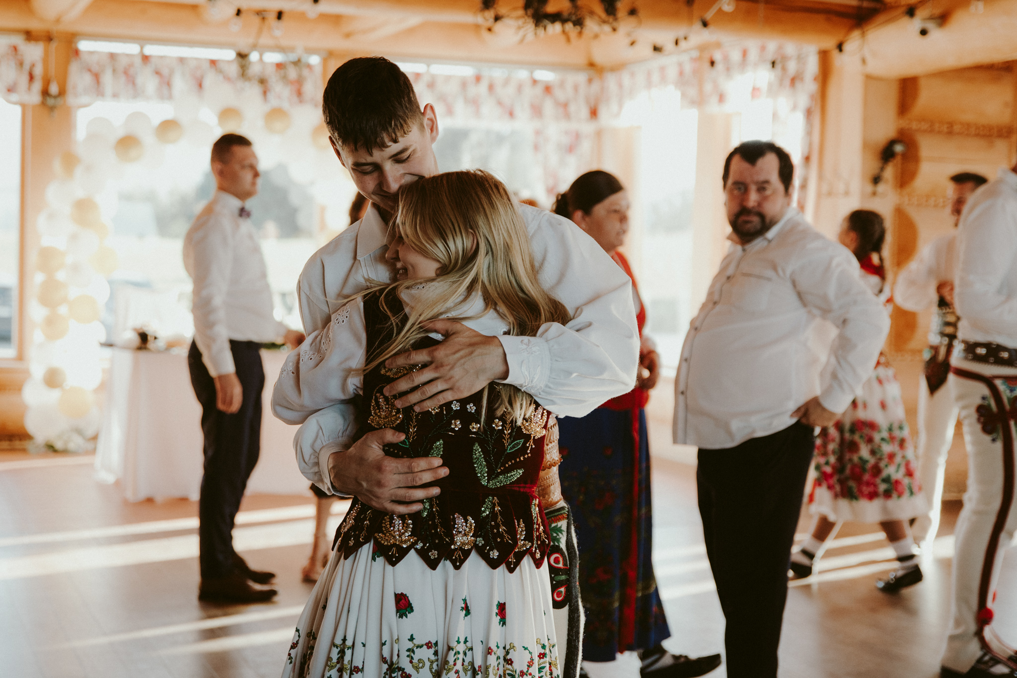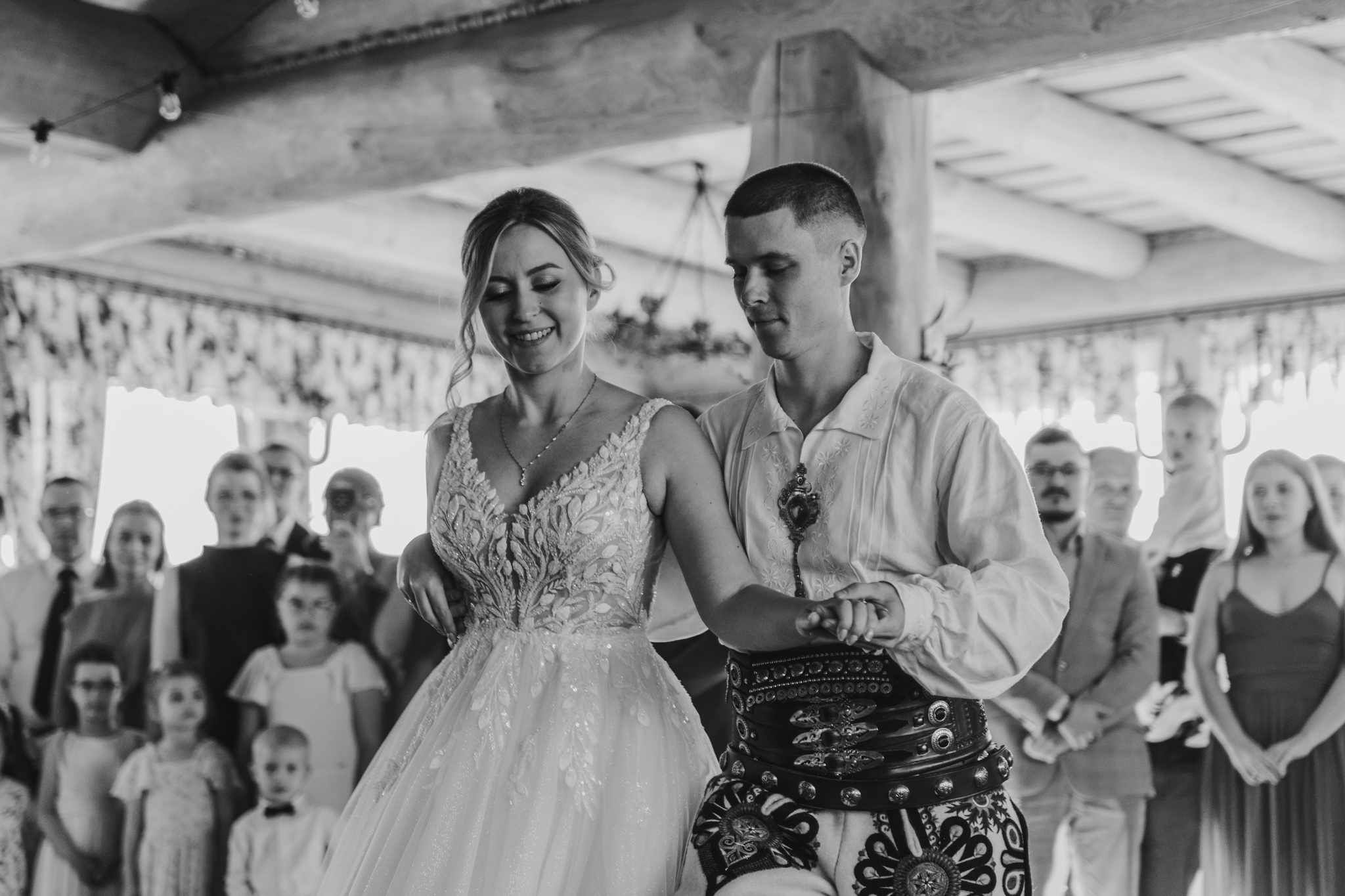Zosia i Michał poznali się na studiach geodezyjnych – tam, między mapami i pomiarami, zaczęli kreślić wspólny plan na życie. We wrześniu przysięgli sobie miłość w kościele w Brzegach, niedaleko Bukowiny Tatrzańskiej. Górskie powietrze pachniało jesienią, a dźwięk skrzypiec mieszał się ze śmiechem i okrzykami gości w barwnych, góralskich strojach. Para młoda przyjechała bryczką zaprzężoną w konie, prowadzoną przez górali. Michał w tradycyjnym stroju góralskim i Zosia w delikatnej, klasycznej sukni wyglądali jak z opowieści – nowoczesność spotkała się z tradycją, tworząc historię, którą długo będziemy pamiętać.