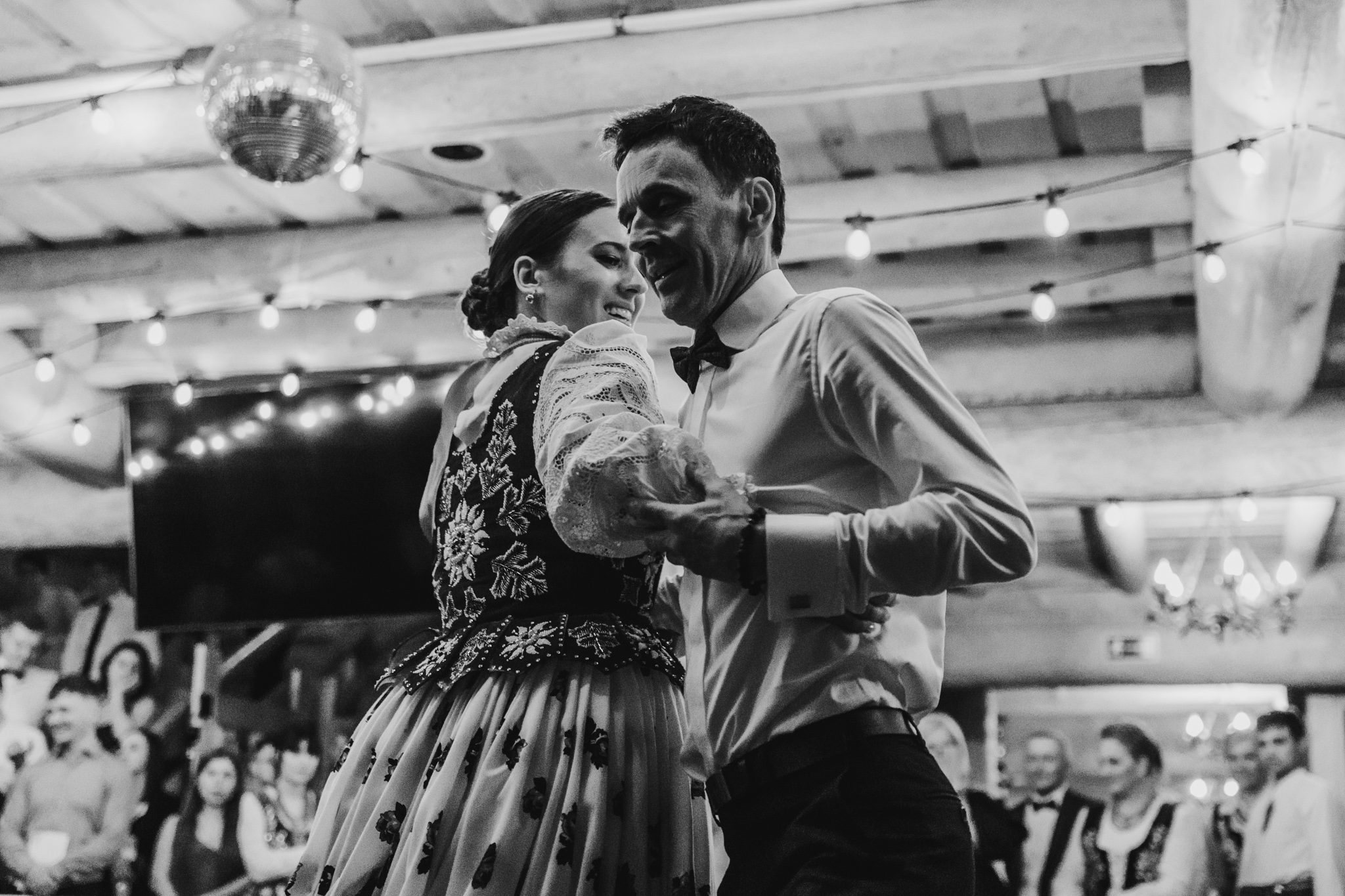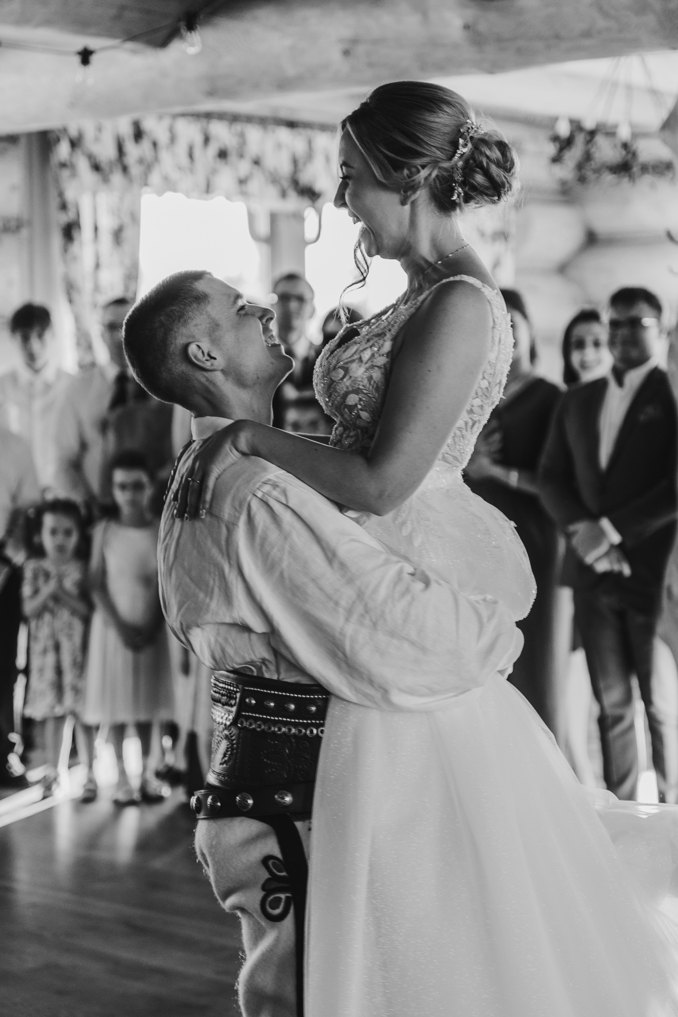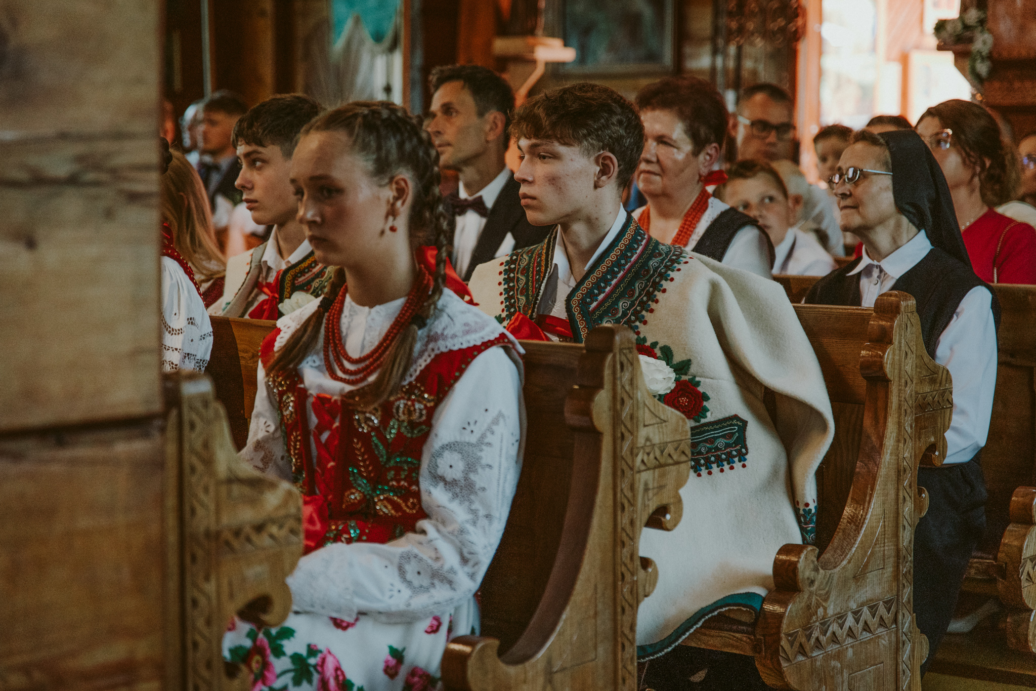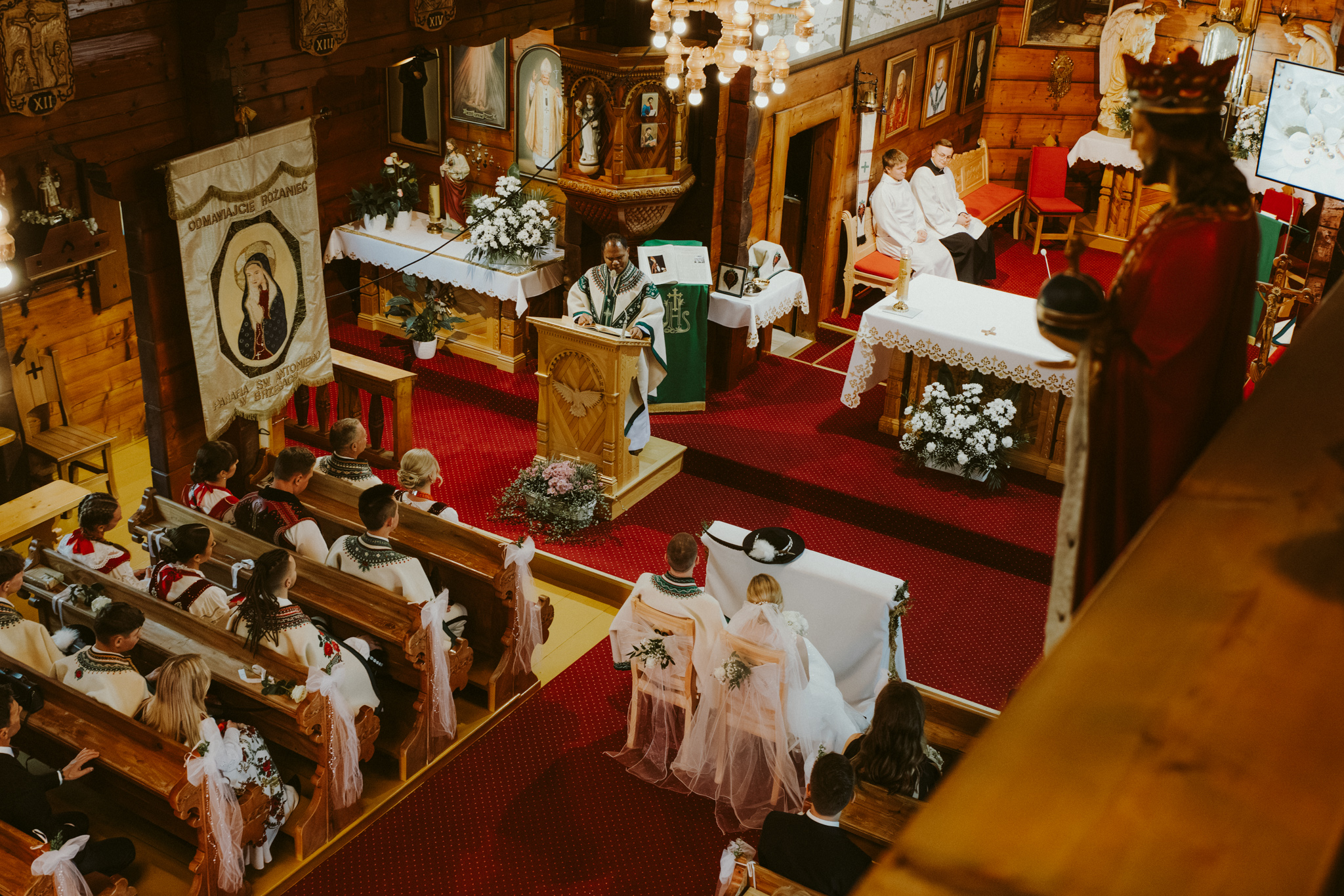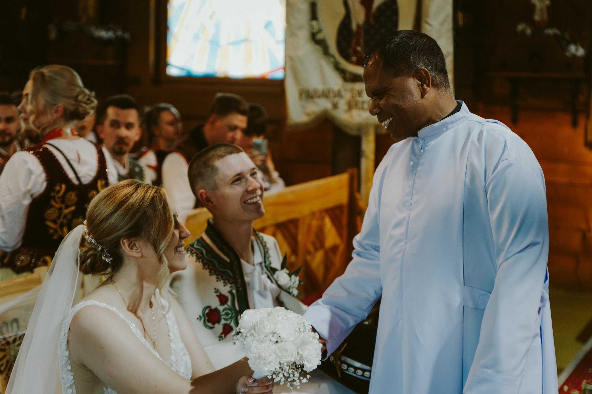 Zosia i Michał poznali się na studiach geodezyjnych – tam, między mapami i pomiarami, zaczęli kreślić wspólny plan na życie. We wrześniu przysięgli sobie miłość w kościele w Brzegach, niedaleko Bukowiny Tatrzańskiej. Górskie powietrze pachniało jesienią, a dźwięk skrzypiec mieszał się ze śmiechem i okrzykami gości w barwnych, góralskich strojach. Para młoda przyjechała bryczką zaprzężoną w konie, prowadzoną przez górali. Michał w tradycyjnym stroju góralskim i Zosia w delikatnej, klasycznej sukni wyglądali jak z opowieści – nowoczesność spotkała się z tradycją, tworząc historię, którą długo będziemy pamiętać.